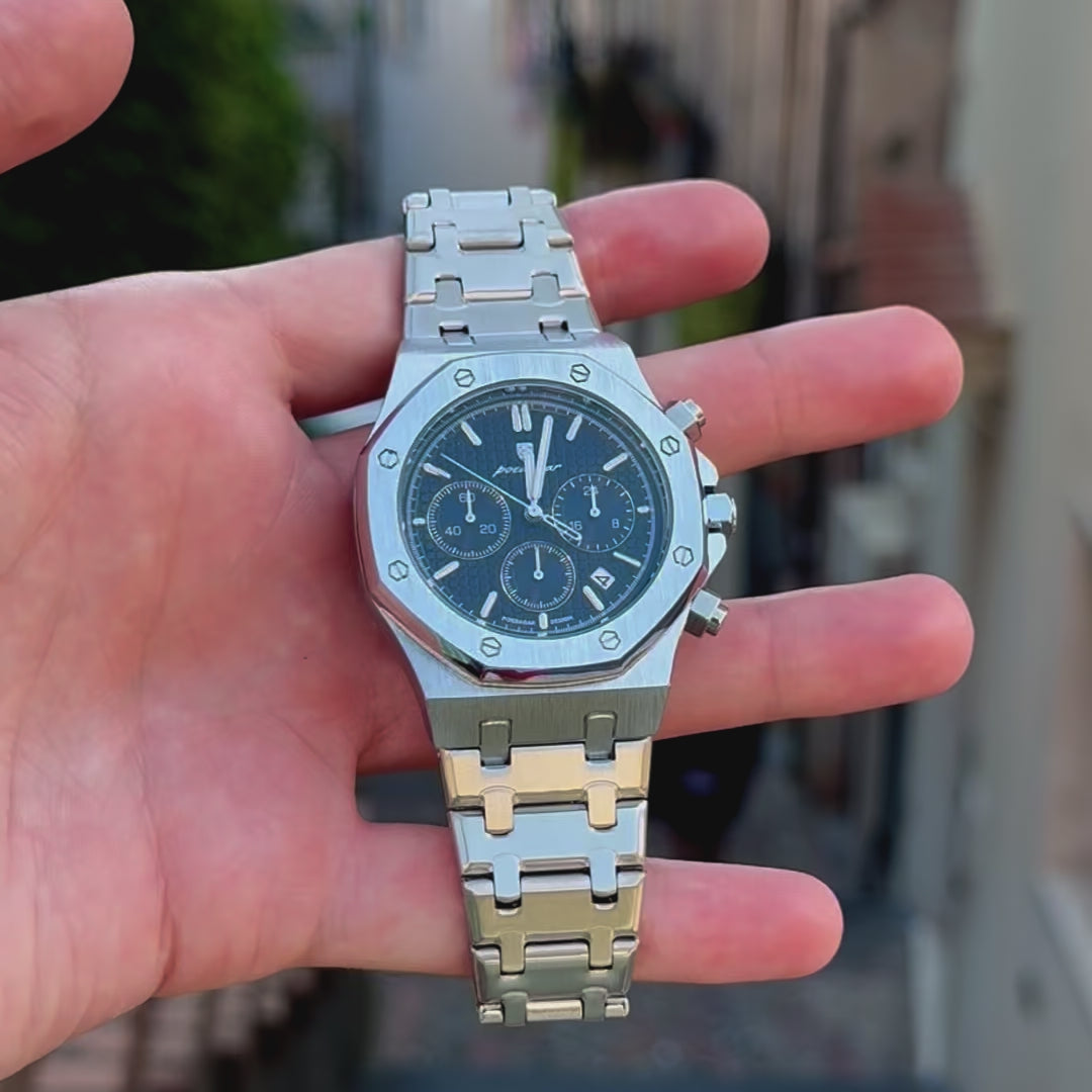 - Finisaje premium: Fiecare detaliu este atent finisat – de la bezelul cu șuruburi decorative până la textura cadranului și gravura discretă de pe spate, toate contribuind la un look exclusivist.